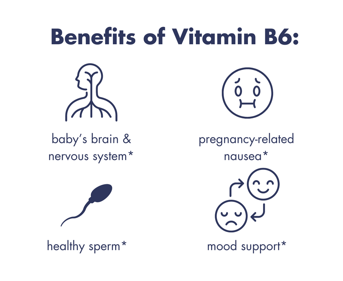Once you do conceive, vitamin B6 will get to work supporting the normal, healthy function of the brain and nervous system, playing a major role in the healthy development of your baby, and overseeing the production of key chemical messengers (4).*