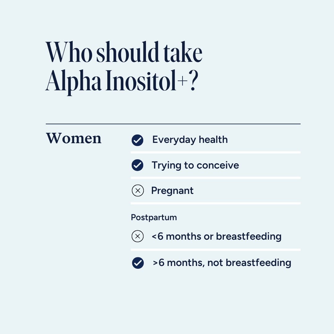 Alpha Inositol+ is not recommended for use during pregnancy or while breastfeeding unless advised by your healthcare provider. Alpha Inositol+ can be used if you aren’t breastfeeding. If you are actively trying for a family, continue taking it until you have a confirmed positive pregnancy test.