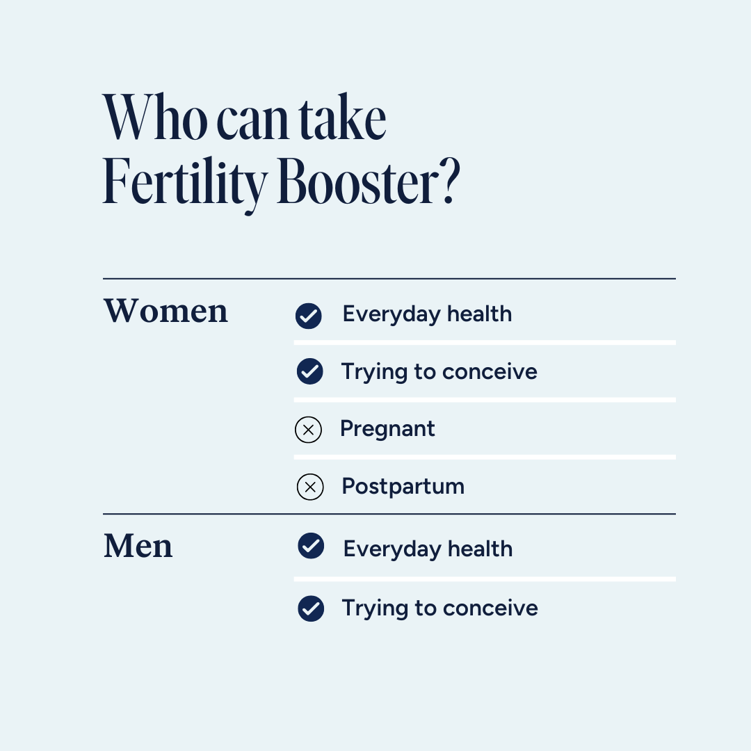 The role of fertile, healthy sperm goes beyond just conception. Sperm quality; count, motility (movement), and morphology (shape and size) all contribute to overall healthy pregnancy and the health of the baby over the long term. Our Fertility Booster is designed to work alongside our respective multivitamins to support optimal sperm quality, hormone health, and overall male fertility. Several of the nutrients work together to support sperm parameters (quality, and structure), healthy free-radical defenses, hormone levels, and overall wellness, which means it is also an excellent supplement for men to continue taking well beyond conception.