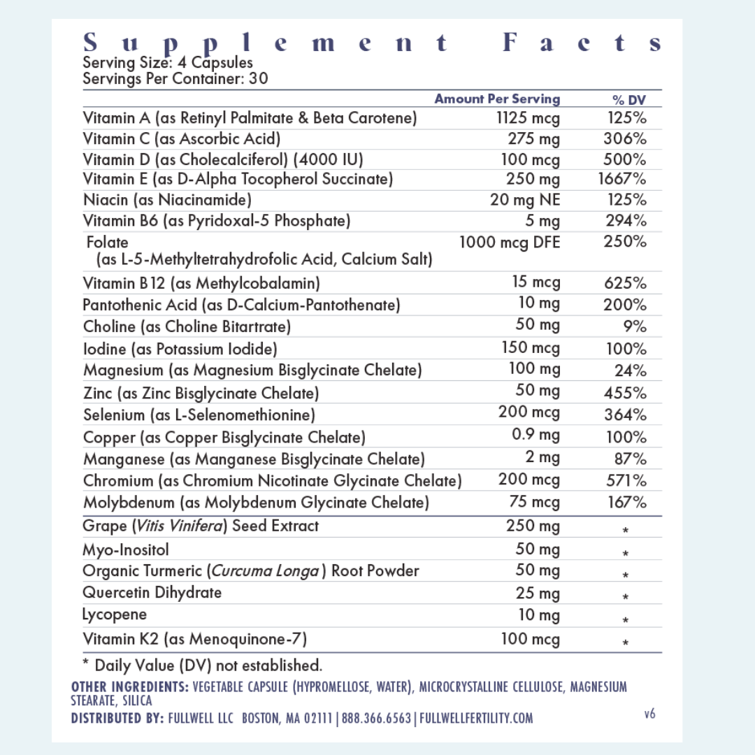 Vitamin A (as Retinyl Palmitate & Beta Carotene) 1125 mcg, Vitamin C (as Ascorbic Acid) 275 mg, Vitamin D (as Cholecalciferol) (4000 IU) 100 mcg , Vitamin E (as D-Alpha Tocopherol Succinate) 250 mg, Niacin (as Niacinamide) 20 mg NE, Vitamin B6 (as Pyridoxal-5-Phosphate) 5 mg, Folate (as L-5-Methyltetrahydrofolic Acid, Calcium Salt) 1000 mcg DFE (588 mcg), Vitamin B12 (as Methylcobalamin) 15 mcg, Pantothenic Acid (as D-Calcium Pantothenate) 10 mg, Choline (as Choline Bitartrate) 50 mg, Iodine (from Kelp) 150 mcg, Magnesium (as Magnesium Bisglycinate Chelate) 100 mg, Zinc (as Zinc Bisglycinate Chelate) 50 mg, Selenium (as L-Selenomethionine) 200 mcg, Copper (as Copper Bisglycinate Chelate) 0.9 mg, Manganese (as Manganese Bisglycinate Chelate) 2 mg, Chromium (as Chromium Nicotinate Glycinate Chelate) 200 mcg, Molybdenum (as Molybdenum Glycinate Chelate) 75 mcg, Grape (Vitis vinifera) Seed Extract 250 mg, Myo-Inositol 50 mg, Organic Turmeric (Curcuma longa) Root Powder 50 mg, Quercetin Dihydrate 25 mg, Lycopene 10 mg, Vitamin K2 (as Menaquinone-7) 100 mcg, Other Ingredients: Vegetable Capsule (Hypromellose, Water), Microcrystalline Cellulose, Magnesium Stearate, Silica.