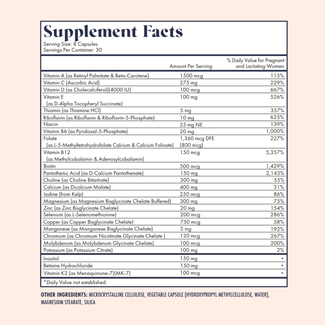 Our Women's Prenatal Multivitamin is formulated to provide optimal nutrition before, during, and after pregnancy using evidence-based forms and doses of essential vitamins and minerals.* Expert-formulated and OBGYN-recommended, it is packed with essential pregnancy nutrients commonly left out of most prenatals to support both mom and baby with the most comprehensive nutritional support.*